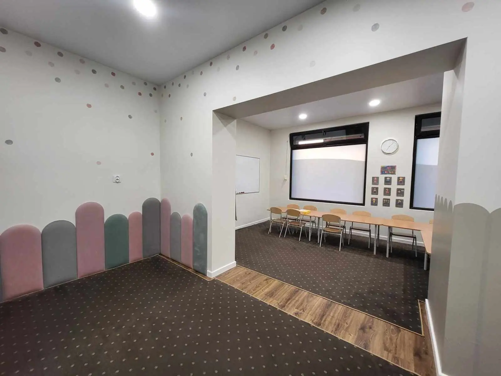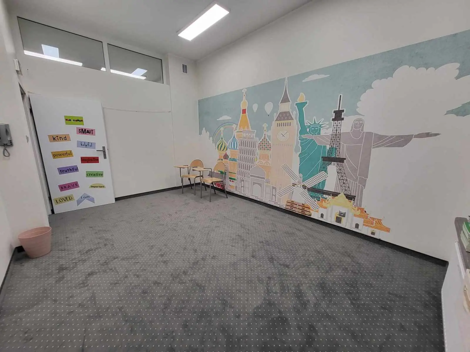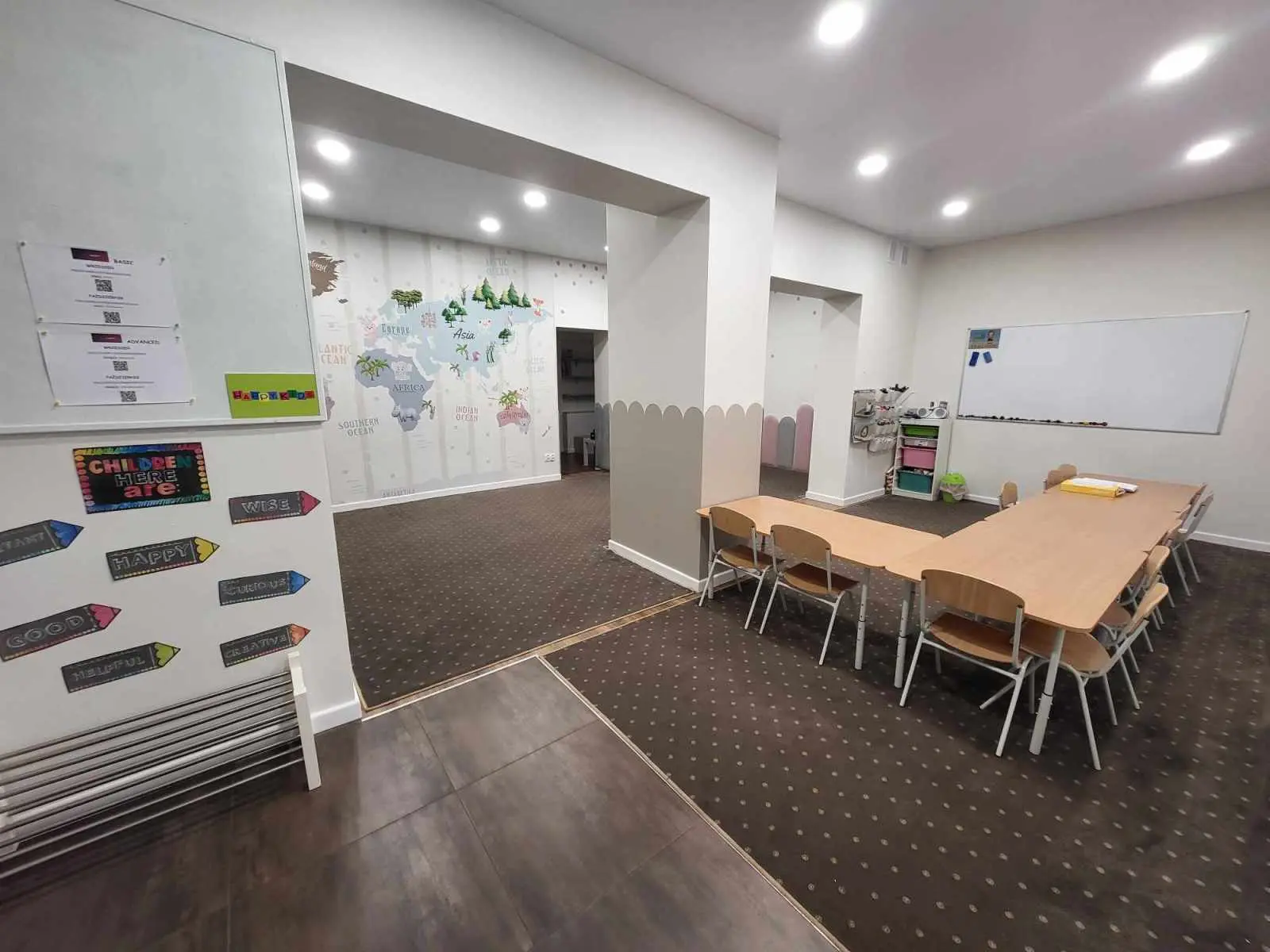 Kadry pokazujące przestrzeń szkoły, sale lekcyjne i zaplecze bez udziału dzieci.